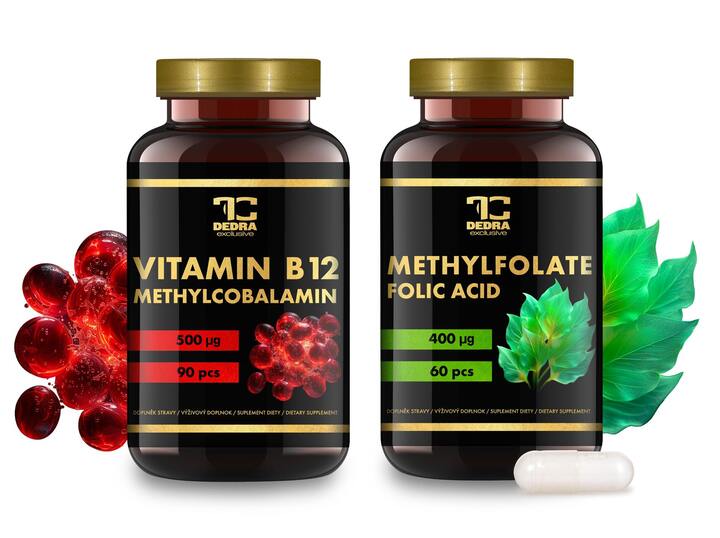 Zestaw 1+1 zawiera: 1x WITAMINA B12- METYLOKOBALAMINA, 500 μg, 90 szt. + 1x METYLOFOLIAN w aktywnej formie- KWAS FOLIOWY, 400 μg, 60 szt.