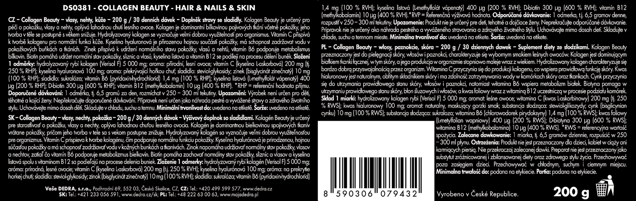 Skład 1 miarki: hydrolizowany kolagen rybi (Verisol F) 5 000 mg; aromat: naturalny, owoce leśne; witamina C (kwas L-askorbinowy) 200 mg (tj. 250% RWS); kwas hialuronowy 100 mg; aromat: naturalny, maskujący gorzki smak; substancja słodząca: glikozydy stewiolowe; cynk (bisglicynian cynku) 10 mg (100% RWS); substancja słodząca: sukraloza; witamina B6 (chlorowodorek pirydoksyny) 1,4 mg (100% RWS); kwas foliowy (L-metylofolian wapnia) 400 µg (200% RWS); D-biotyna 300 µg (600% RWS); witamina B12 (metylokobalamina) 10 µg (400% RWS).
