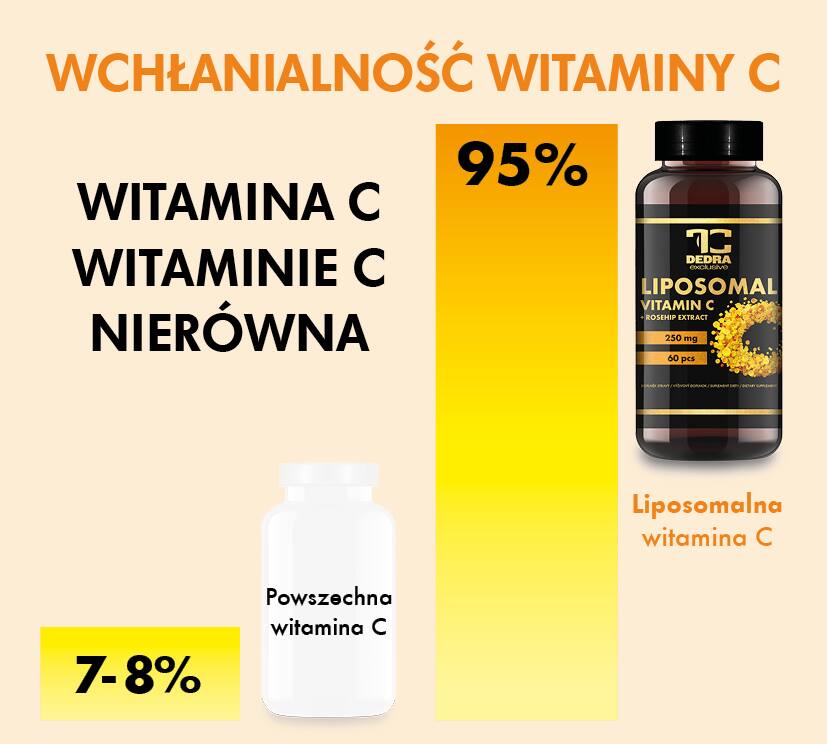 Liposomalna witamina C w synergicznym kompleksie z ekstraktem z dzikiej róży zapewnia bardzo wysoką wchłanialność i biodostępność. W przeciwieństwie do zwykłych form witaminy C, jej absorpcja wynosi aż 95%.