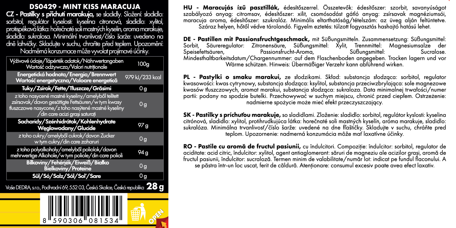 Skład: substancja słodząca: sorbitol, regulator kwasowości: kwas cytrynowy, substancja słodząca: ksylitol, substancja przeciwzbrylająca: sole magnezowe kwasów tłuszczowych, aromat marakui, substancja słodząca: sukraloza.