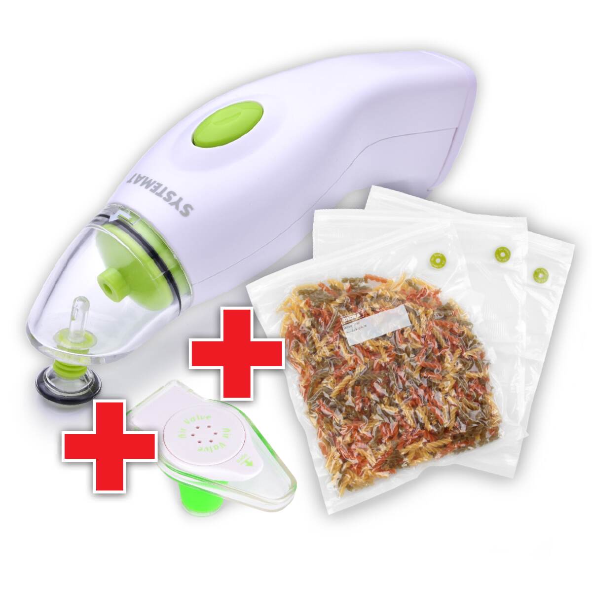 POWIETRZOZASYSACZ® automatyczne elektryczne urządzenie do pakowania próżniowego jest sprzedawane w zestawie z 3 specjalnymi workami próżniowymi oraz próżniowym korkiem do butelek GRATIS.