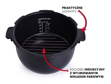 COMBIVAR® INDUCTION NEO to wielofunkcyjne indukcyjne centrum gotowania i szybkowar z wewnętrznym naczyniem do gotowania o objętości 5 litrów z powierzchnią nieprzywierającą BIOPAN®, dzięki której potrawy się nie przykleją i nie przypalą.