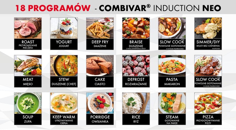 Wystarczy włożyć składniki, wybrać jeden, a COMBIVAR® INDUCTION NEO zrobi już wszystko za Ciebie. Pracuje cicho, bez zapachu, a jedzenie jest smaczne. W krótkim czasie i bez wysiłku ugotujesz wszelkiego rodzaju dania główne, przystawki i desery: