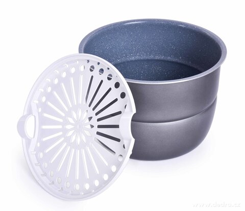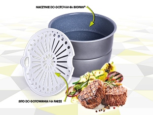 • w zestawie sitko do gotowania na parze z wytrzymałego utwardzonego plastiku. Praktyczne uchwyty umożliwiają łatwą manipulację. Systemem otworów para przenika równomiernie do jedzenia.