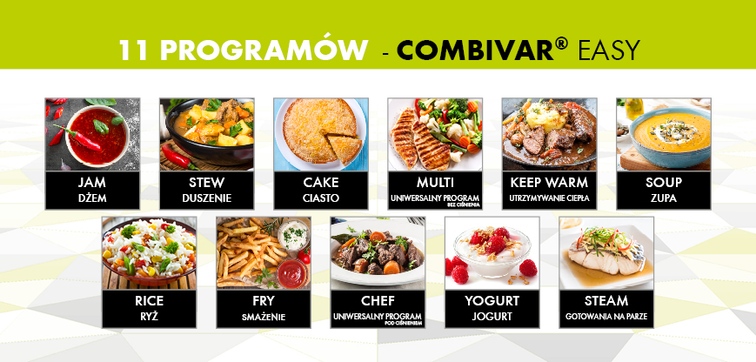 Wystarczy włożyć składniki, wybrać jeden, a COMBIVAR® EASY zrobi już wszystko za Ciebie. Pracuje cicho, bez zapachu, a jedzenie jest smaczne. W krótkim czasie i bez wysiłku ugotujesz wszelkiego rodzaju dania główne, przystawki i desery: