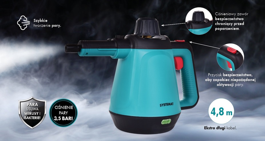 Czyszczenie parą niezawodnie usuwa wirusy i bakterie! Idealny do szybkiego, ciągłego i wydajnego sprzątania.