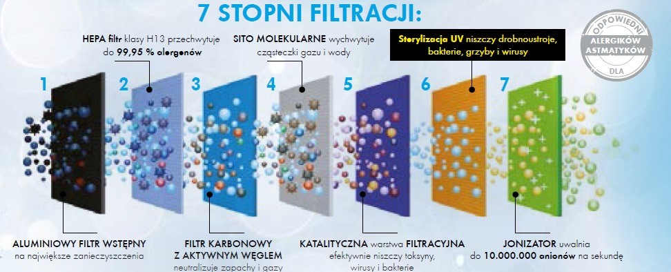 HEPA H13 filtr najwyższej jakości! Przechwyci do 99,95% cząstek, które przechodzą przez filtry, czym skutecznie zmniejsza ilość wirusów, alergenów, gazów i nieprzyjemnych zapachów...
