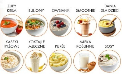 Przygotuje pyszne kremowe zupy, esencjonalne buliony, domowe sosy, aksamitne mleka roślinne, koktajle mleczne czy pełne witamin smoothie, a także delikatne purée i posiłki dla dzieci.