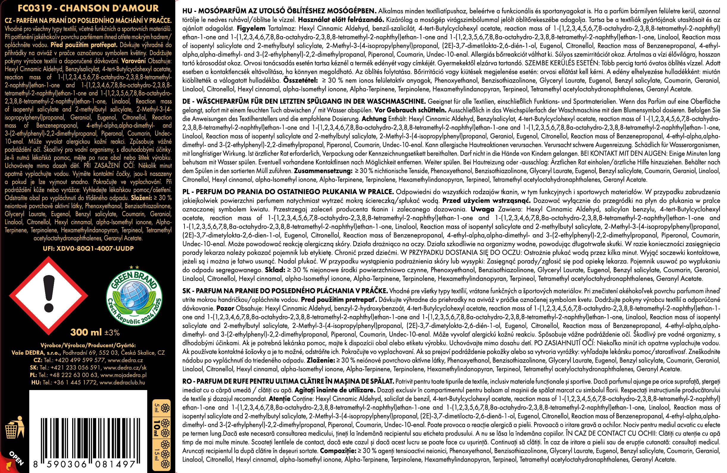 PARFUMAGE® SUPREME CHANSON D´AMOUR – 4× mniejsza dawka, 4× większy efekt. Wystarczy tylko 5–15 ml do prania, a Twoje pranie zyska intensywny oraz długotrwały zapach. Ożywia kolory, neutralizuje resztki detergentów i jest delikatny dla skóry oraz pralki. Mniejsza dawka – większy efekt, odpowiednie nawet do 95 °C.