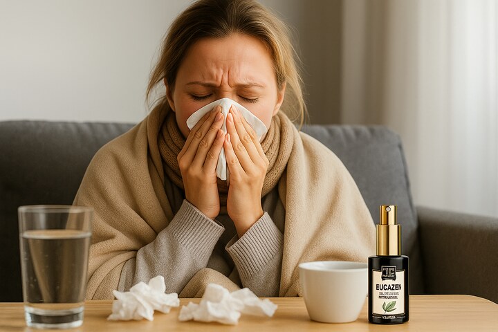 EUCAZEN – naturalny spray z olejkami eterycznymi eukaliptusa, mięty i mentolu. Pomaga udrożnić drogi oddechowe oraz przynosi ulgę przy katarze. Odświeża powietrze, wspiera swobodne oddychanie i szybko łagodzi objawy przeziębienia – idealny w domu i w podróży.