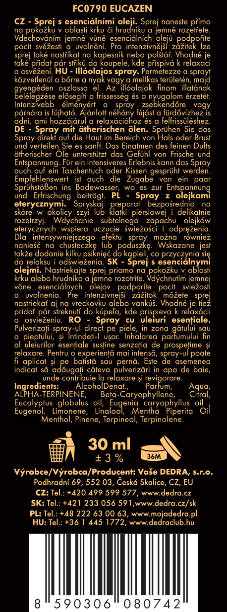 Eucazen to spray z olejkami eterycznymi eukaliptusa, mięty pieprzowej i mentolu, który pomaga udrożnić drogi oddechowe oraz ułatwia oddychanie podczas przeziębienia lub zatkanego nosa.