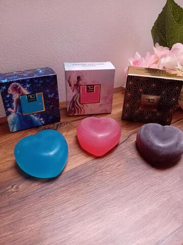 Wymiary: mydło ok. szer. 6 x gł. 6 x wys. 3 cm, opakowanie szer. 8 x gł. 8 x wys. 3,5 cm.