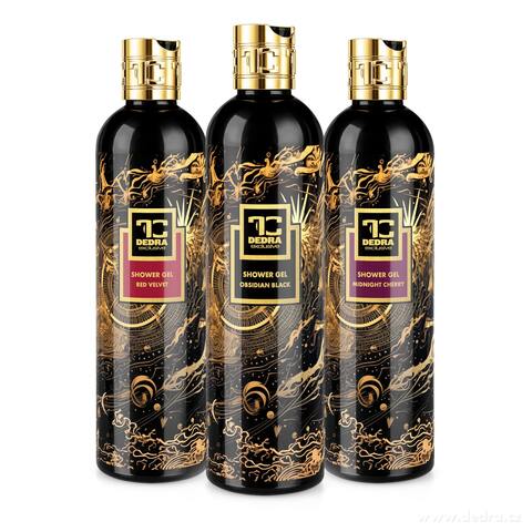 W komplecie: 1 x naturalny łagodny żel pod prysznic z gliceryną i Aloe vera OBSIDIAN BLACK 320 ml, 1 x naturalny łagodny żel pod prysznic z gliceryną i Aloe vera RED VELVET 320 ml, 1 x naturalny łagodny żel pod prysznic z gliceryną i Aloe vera MIDNIGHT CHERRY 320 ml.
