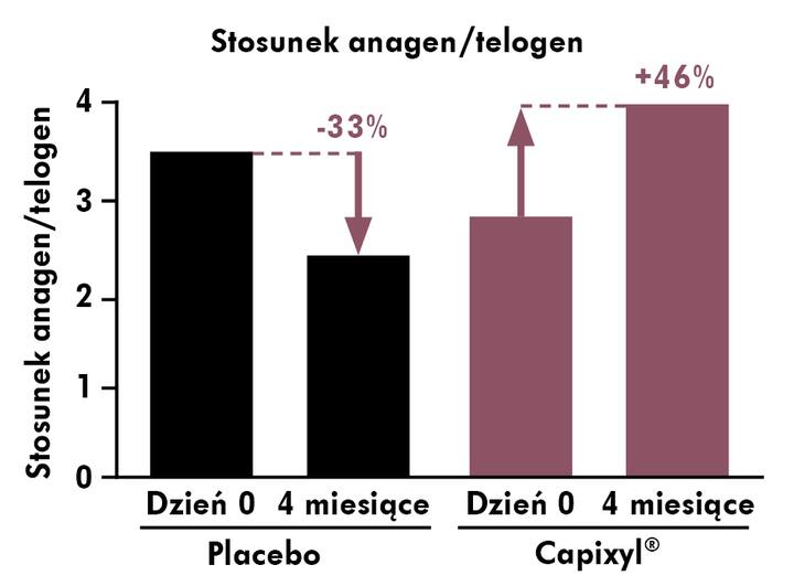 Capixyl® zwiększa stosunek ANAGEN/TELOGEN o 46% w porównaniu z obniżeniem o -33% u placebo.