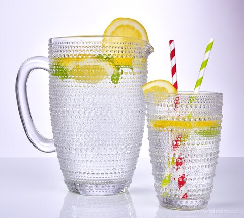 Duży dzbanek szklany z uchem i tłoczoną powierzchnią, objętość 1400 ml.