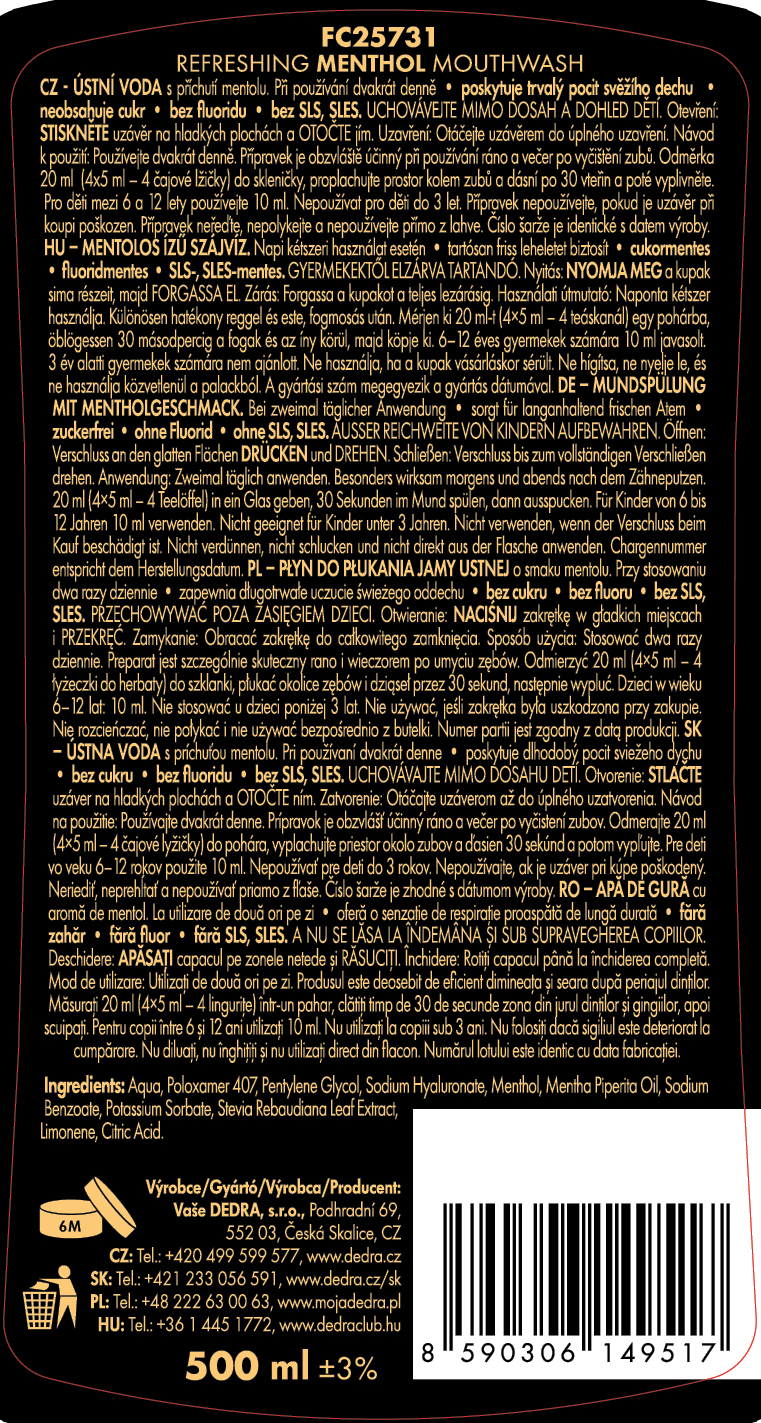 DEDRA DENT | naturalny ziołowy płyn do płukania ust REFRESHING MENTHOL z kwasem hialuronowym & stewią | nawilżenie & świeży oddech | 500 ml.