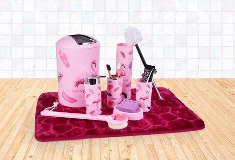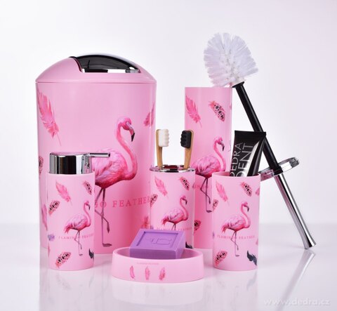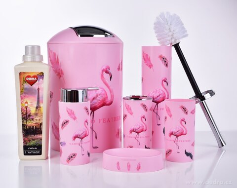 6-elementowy zestaw łazienkowy, flaming, z odpornego plastiku, części ozdobne wykończone w kolorze srebrnego metalu o wysokim połysku.