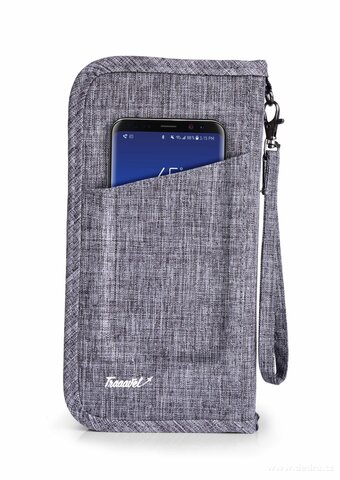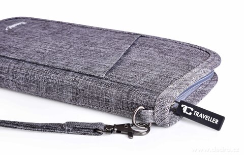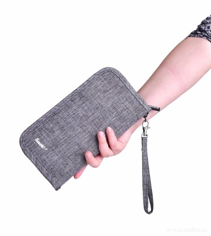 Etui na dokumenty z odpinaną pętelką na rękę, z szarego melanżowego materiału na suwak,