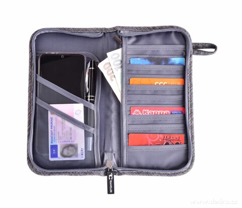 i kieszenią na suwak + 11 przegródek na karty. Wymiary: 12 x 2,5 x 23 cm.