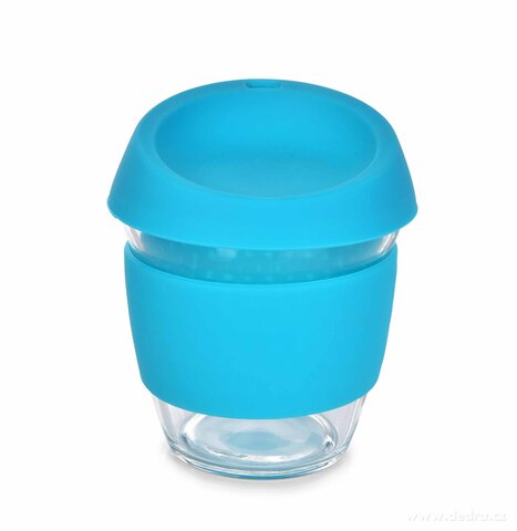 KELIMERO® szklany kubek ze zdejmowanym silikonowym paskiem i pokrywką, grubościenne szkło. Średnica 8,5 cm.