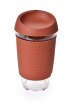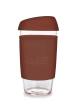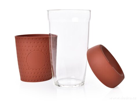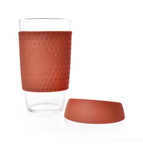 KELIMERO® szklany kubek ze zdejmowanym silikonowym paskiem i pokrywką, grubościenne szkło. Średnica 8,5 cm. Pojemność 500 ml, wysokość 14,3 cm (z pokrywką 16,5 cm).