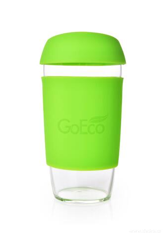 KELIMERO® szklany kubek ze zdejmowanym silikonowym paskiem i pokrywką, grubościenne szkło. Średnica 8,5 cm. Pojemność 500 ml, wysokość 14,3 cm (z pokrywką 16,5 cm).