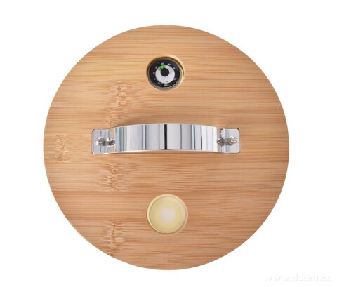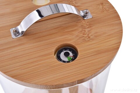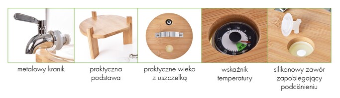 z metalowym kurkiem, bambusową podstawą i pokrywką z silikonową uszczelką,