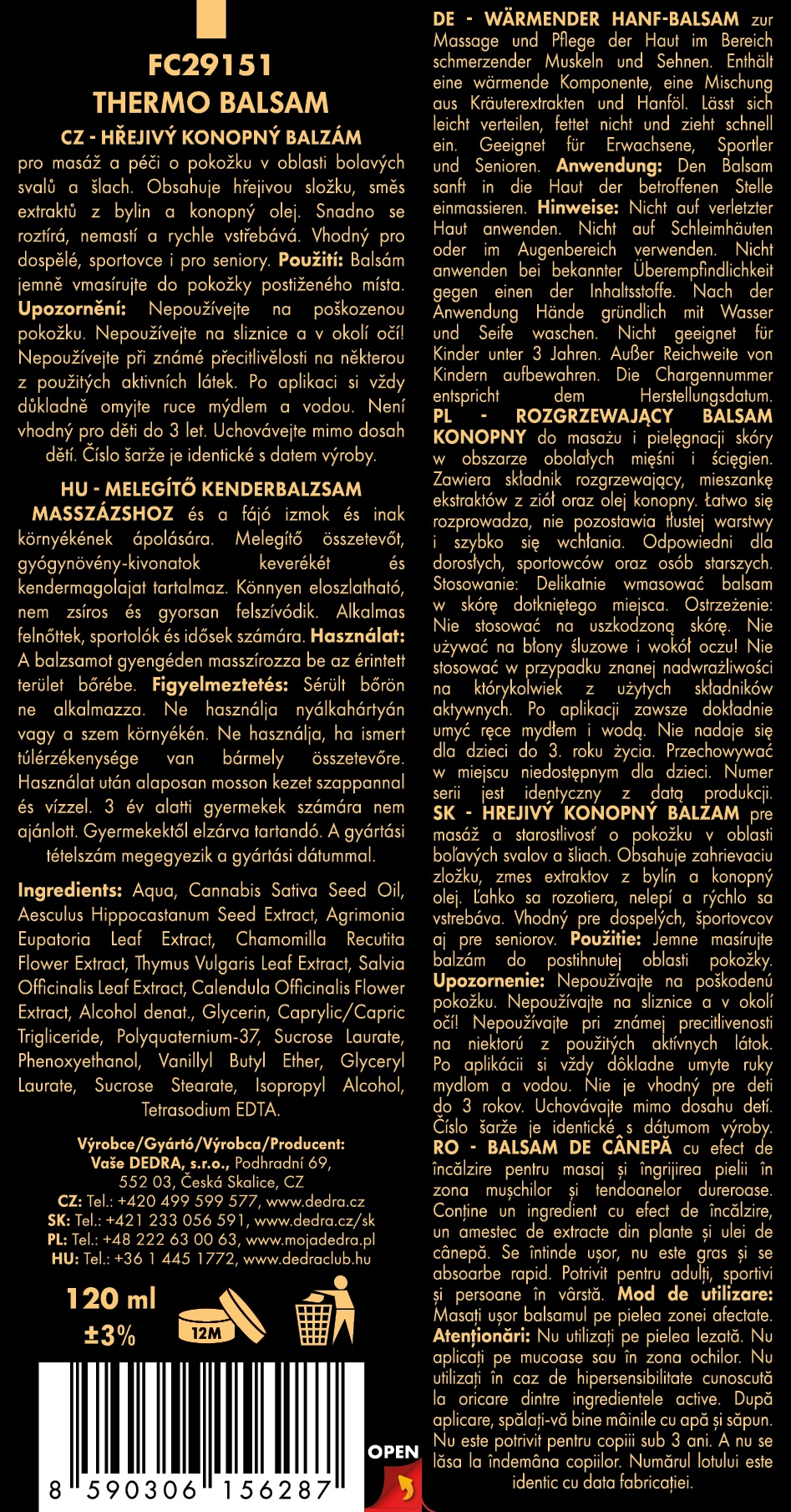 THERMOBALSAM to skuteczny rozgrzewający balsam o wysokiej zawartości 10% oleju konopnego, przeznaczony do masażu i pielęgnacji skóry w okolicach mięśni, ścięgien oraz stawów. Dzięki składnikowi rozgrzewającemu zapewnia wyraźny i długotrwały efekt rozgrzania, który wspiera ukrwienie, rozluźnienie oraz regenerację przeciążonych lub sztywnych miejsc.
