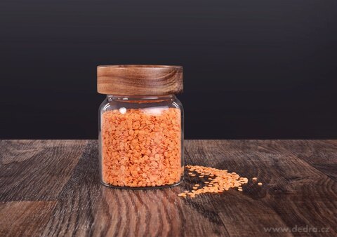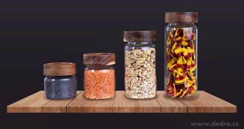 SZKLANE POJEMNIKI z wytrzymałego szkła borokrzemowego z zakręcanym wiekiem z drewna akacjowego (z silikonową uszczelką) świetnie będą się wyróżniać na półce w kuchni.