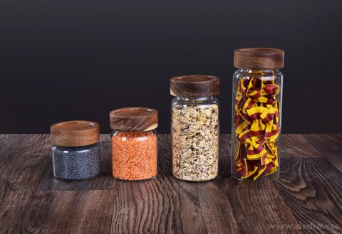SZKLANE POJEMNIKI z wytrzymałego szkła borokrzemowego z zakręcanym wiekiem z drewna akacjowego świetnie będą się wyróżniać na półce w kuchni.