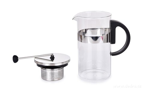 1 l szklany dzbanek do kawy i herbaty z nierdzewnym sitkiem, połączenie wytrzymałego szkła borokrzemowego, stali nierdzewnej i plastiku. Wymiary: 16 x 10 x 20,5 cm.
