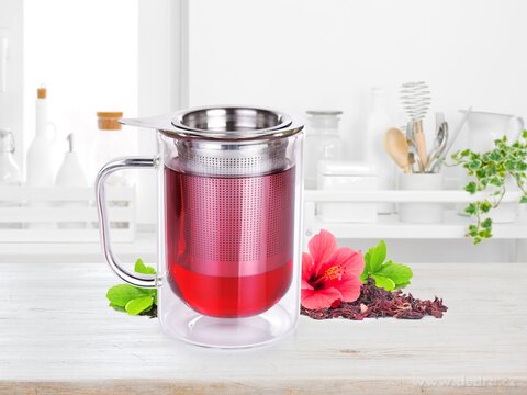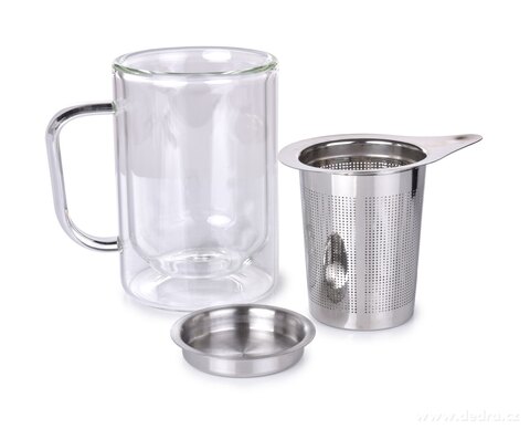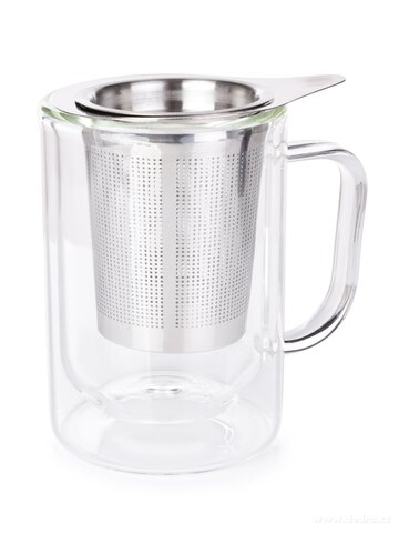 400 ml szklany dwuścienny kubek termiczny BOROSIL DOUBLE-GLASS z nierdzewnym sitkiem i pokrywką. Wymiary: 12 x 8 x 12 cm.