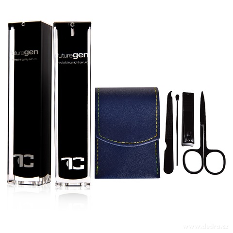Zestaw prezentowy DLA DŻENTELMENÓW to elegancki wybór dla mężczyzny, który dba o wygląd i styl. Zawiera dzienne i nocne serum do twarzy FUTUREGEN oraz 5-elementowy zestaw do manicure w etui z eko skóry. Całość zapakujesz w przezroczysty woreczek — praktyczny i luksusowy prezent dla dżentelmena.