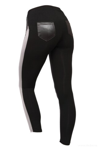 Ciekawy wygląd: błyszcząca przednia część z paskiem na boku, czarna tylna część z błyszczącymi kieszeniami. . Rozmiar uniwersalny (odpowiada S / M, L, XL), wyższa talia, wewnętrzna długość nogi od 70 do 75 cm (są elastyczne i dostosowują długość) Materiał: 35% bawełna, 65% poliester. Pasek boczny optycznie wysmukla sylwetkę.