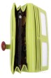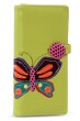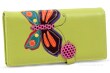 Portfel damski wykonany z ekoskóry, szczelne zamknięcie z aplikacją motyla. Dwie duże kieszenie na banknoty, kieszeń na monety zapinana na suwak, 2 przezroczyste kieszenie na fotografię lub prawo jazdy, 4 kieszenie na karty, 1 ukryta duża zamykana kieszeń np. na banknoty.