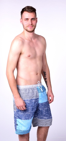 Męskie szaro-białe bermudy kąpielowe mają dwie boczne kieszenie wewnętrzne i jedną zewnętrzną kieszeń tylną, wewnątrz wszyte slipy z siateczki. W pasie na gumie ze sznurowaniem, materiał 100% PES.
