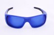 Okulary sportowe w kolorze niebieskim i szarym, wykonane z wysokiej jakości twardego plastiku i szkła z efektem lustra. Posiadają silikonowe wstawki, które sprawdzają się podczas uprawiania sportu. Szkła zapewniają 100% ochronę przed promieniowaniem UV – UV400.