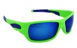 Okulary sportowe w kolorze niebieskim i szarym, wykonane z wysokiej jakości twardego plastiku i szkła z efektem lustra. Posiadają silikonowe wstawki, które sprawdzają się podczas uprawiania sportu. Szkła zapewniają 100% ochronę przed promieniowaniem UV – UV400.