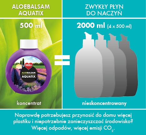 Opakowanie 500 ml balsamu AQUATIX odpowiada czterem klasycznym, nieskoncentrowanym płynom do mycia naczyń ze sklepu.
