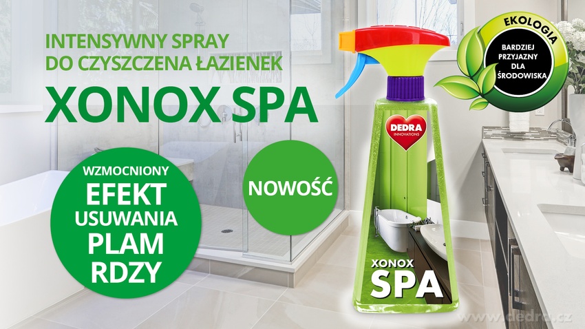 NOWY i INNOWACYJNY spray do czyszczenia kamienia wodnego oraz szarych powłok z kamienia w łazience XONOX SPA. Teraz bardziej przyjazny dla środowiska i skuteczniejszy w usuwaniu plam rdzy.