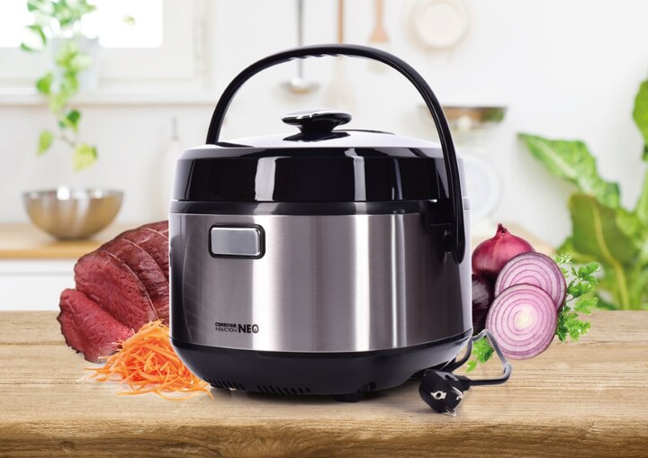 COMBIVAR® INDUCTION NEO 16w1 to wielofunkcyjne centrum gotowania i szybkowar z wewnętrznym naczyniem do gotowania o pojemności 5 litrów z nieprzywierającą powłoką BIOPAN®, dzięki której potrawy nie będą przywierać i przypalać się.