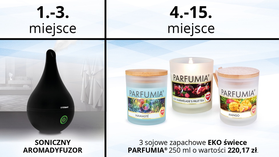 4. do 15. miejsca zyska...........3 sojowe EKO świece zapachowe PARFUMIA® 250 ml o wartości 220,17 zł