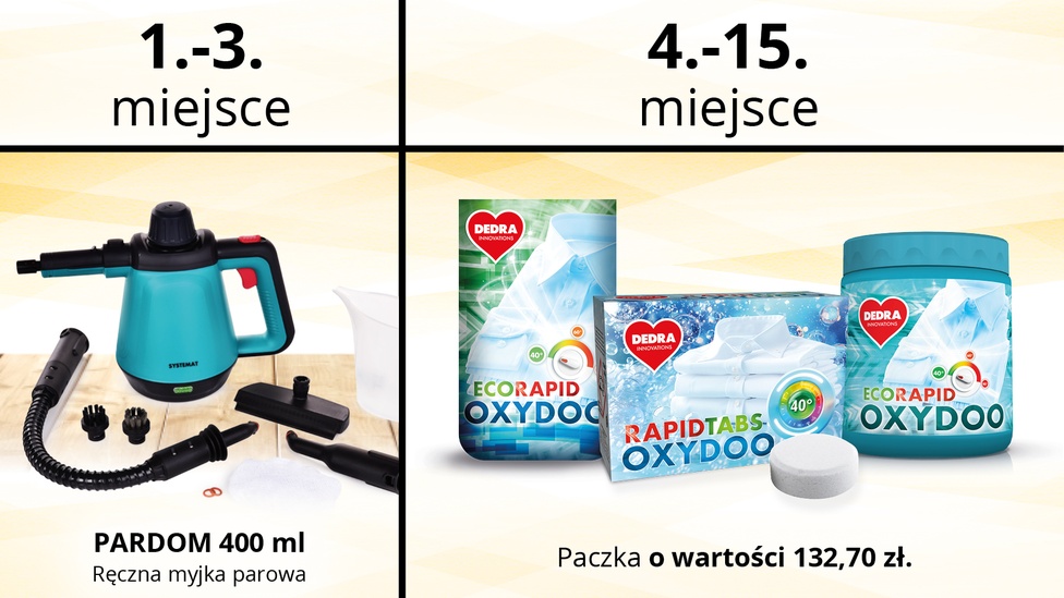 1. do 3. pozycji zyska..................ręczną myjkę parową 400 ml, z bogatym wyposażeniem PARDOM® o wartości 186,79 zł.