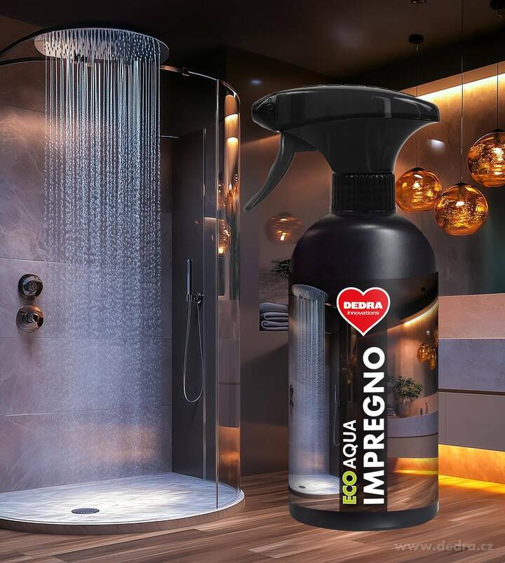 ECO AQUA IMPREGNO – impregnat do kabin prysznicowych, szkła i luster. Chroni przed wodą, osadzaniem kamienia oraz parowaniem. Tworzy niewidoczny film ochronny, który odpycha krople i ułatwia czyszczenie powierzchni. Ekologiczna formuła, skuteczna ochrona oraz długotrwały efekt. 500 ml.