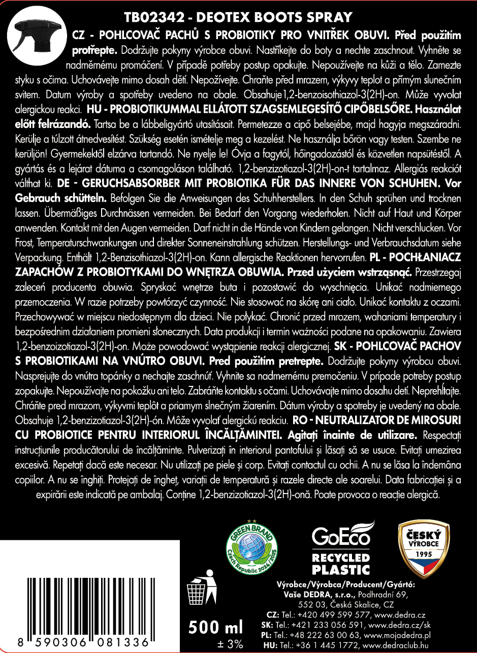 DEOTEX® BOOTS 500 ml – probiotyczny spray do obuwia przeciwko nieprzyjemnym zapachom. Natychmiast neutralizuje zapachy wewnątrz butów, zapewnia długotrwałą świeżość i chroni przed ich powrotem. Bezpieczny dla wszystkich rodzajów obuwia – sportowego, codziennego oraz roboczego.