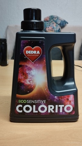 Płynny EKO środek do łagodnego prania kolorowych ubrań ECOSENSITIVE COLORITO, 1500 ml = 30 prań, posiada hipoalergiczny kosmetyczny zapach odświeżającej moreli z urzekającą wanilią.